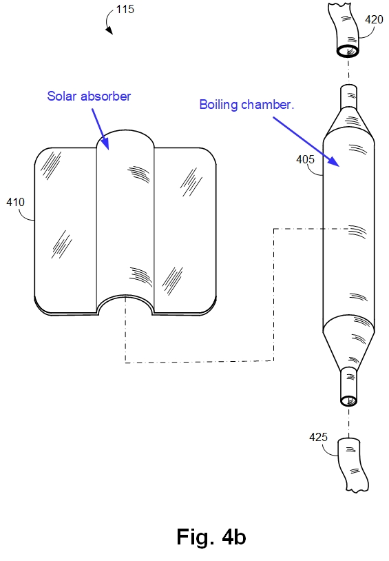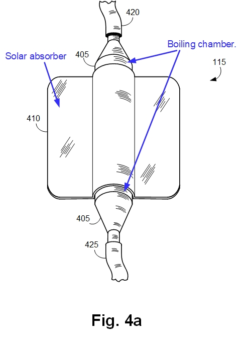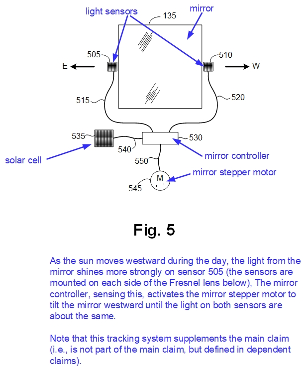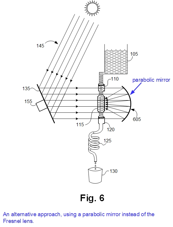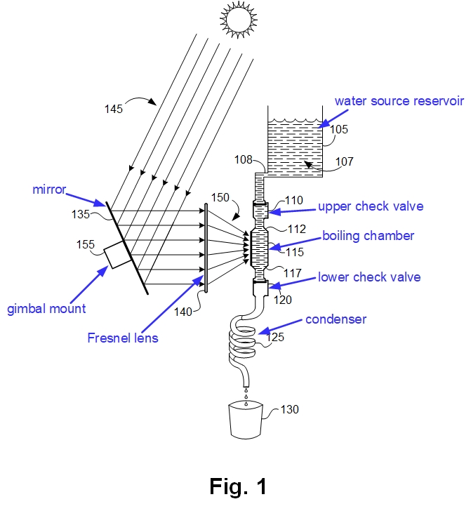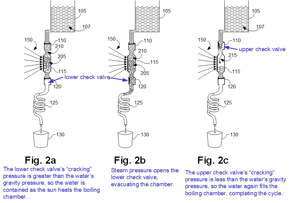 The invention's automation is achieved by a simple, but novel arrangement of check valves, and an inexpensive Fresnel lens, rotated on the polar axis of a gimbal mount by a small, solar-powered motor. The annotated patent application figures below show the scheme.